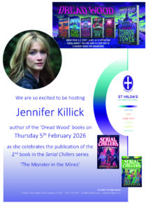 We are so excited to be hosting Jennifer Killick author of the ‘Dread Wood’ books on Thursday 5th February 2026 as she celebrates the publication of the 2nd book in the Serial Chillers series ‘The Monster in the Mines’ Look out for a report on her visit before half term!